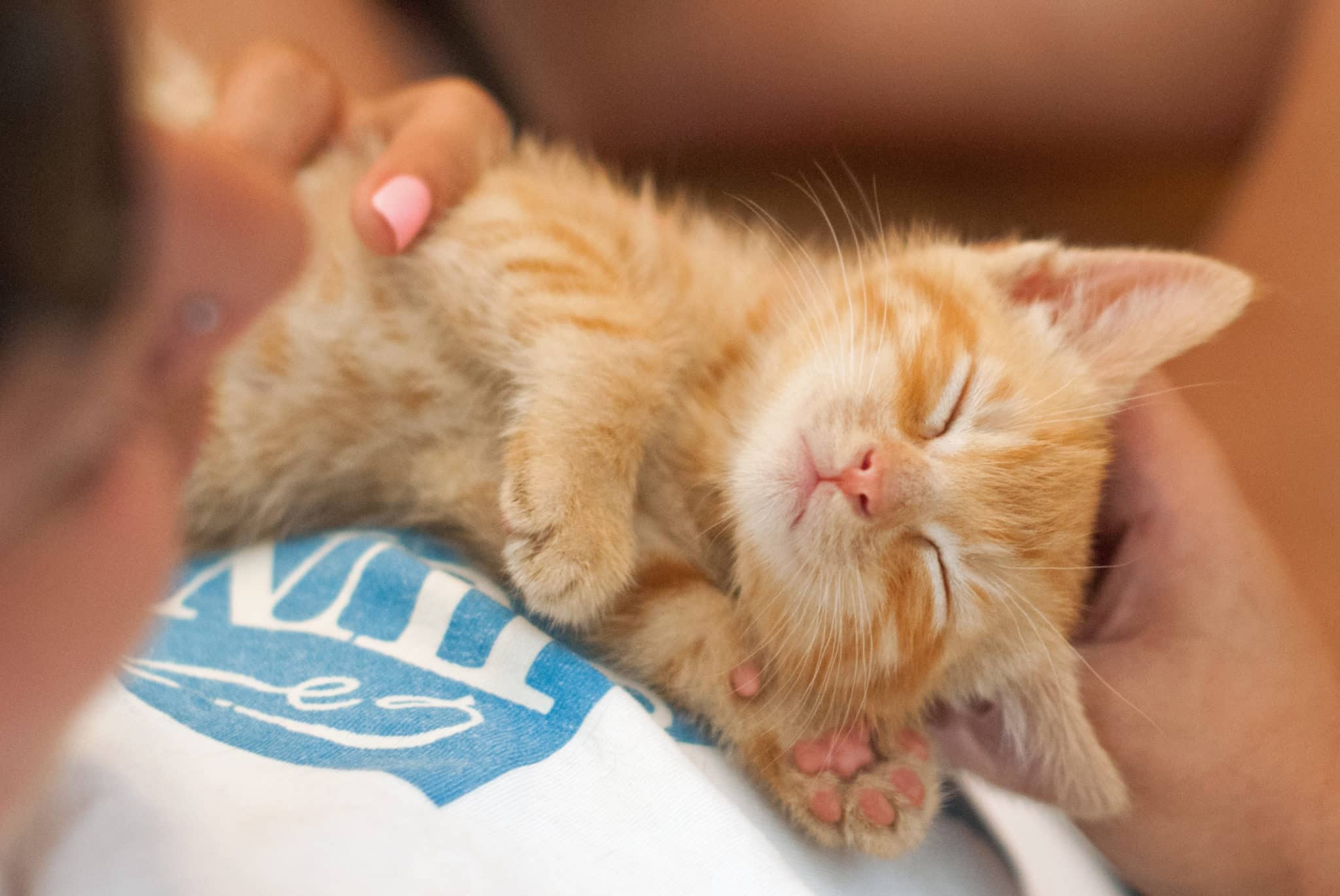 An orange and white kitten taking a nap on a person's lap