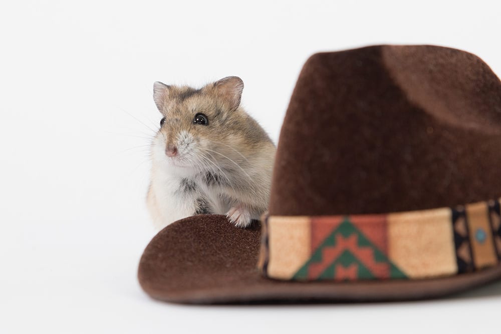 A grey hamster hiding behind a brown hat