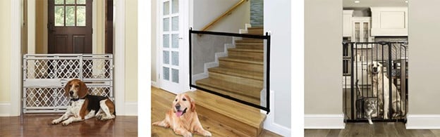 Gates: Gates are another common confinement tool which allow more space for the pet to roam than a crate. They also come in a variety of sizes, materials and styles to fit the space in your home and can be stacked in a doorway or hall for more secure containment.