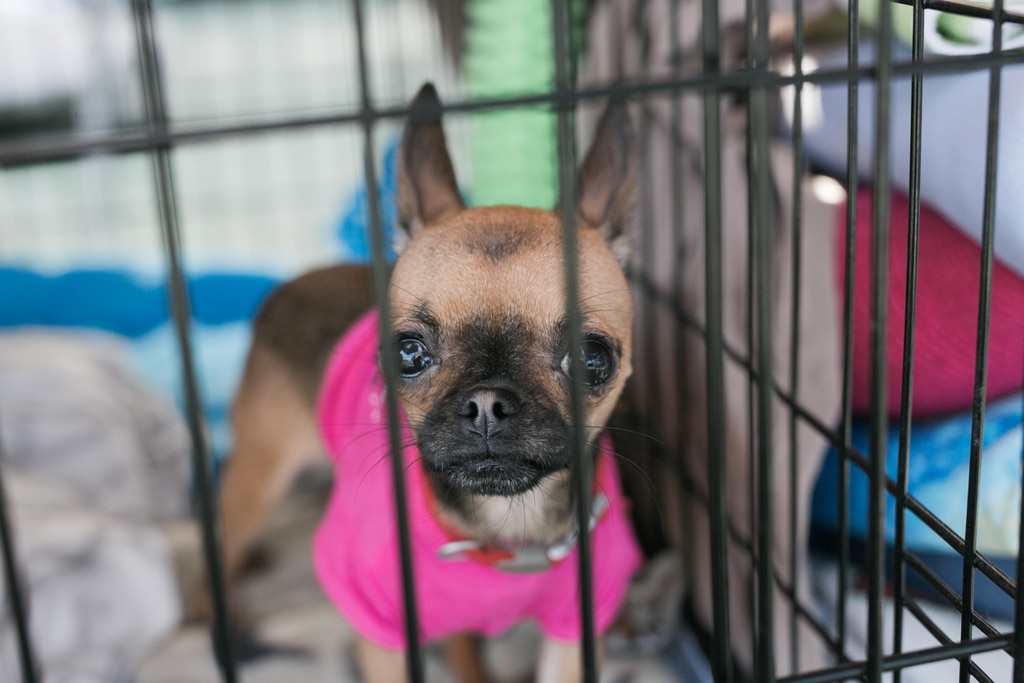 A small dog inside a crate wearing a pink sweater