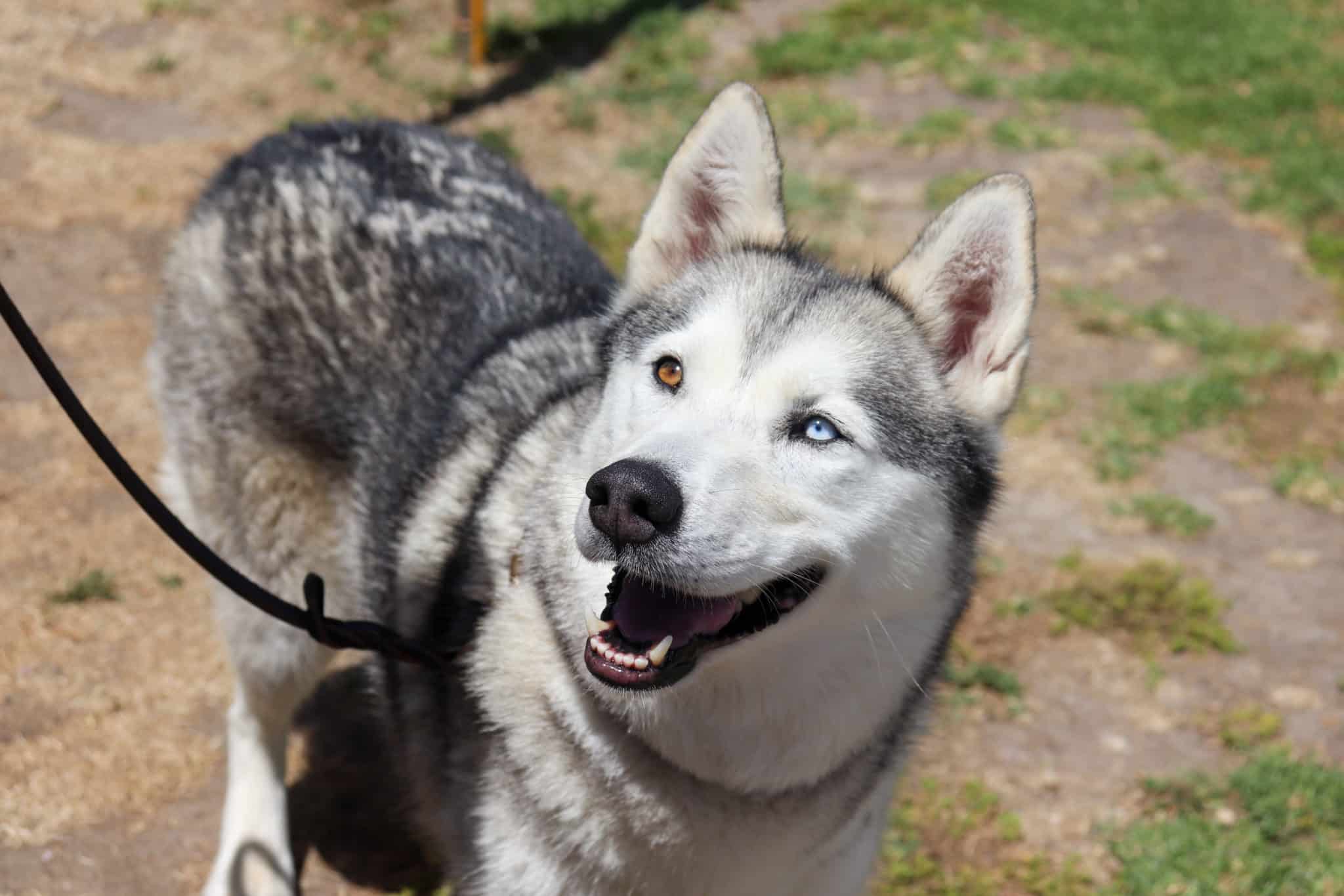 A dog with one blue eye and one brown eye wearing a leash and focusing on their handler